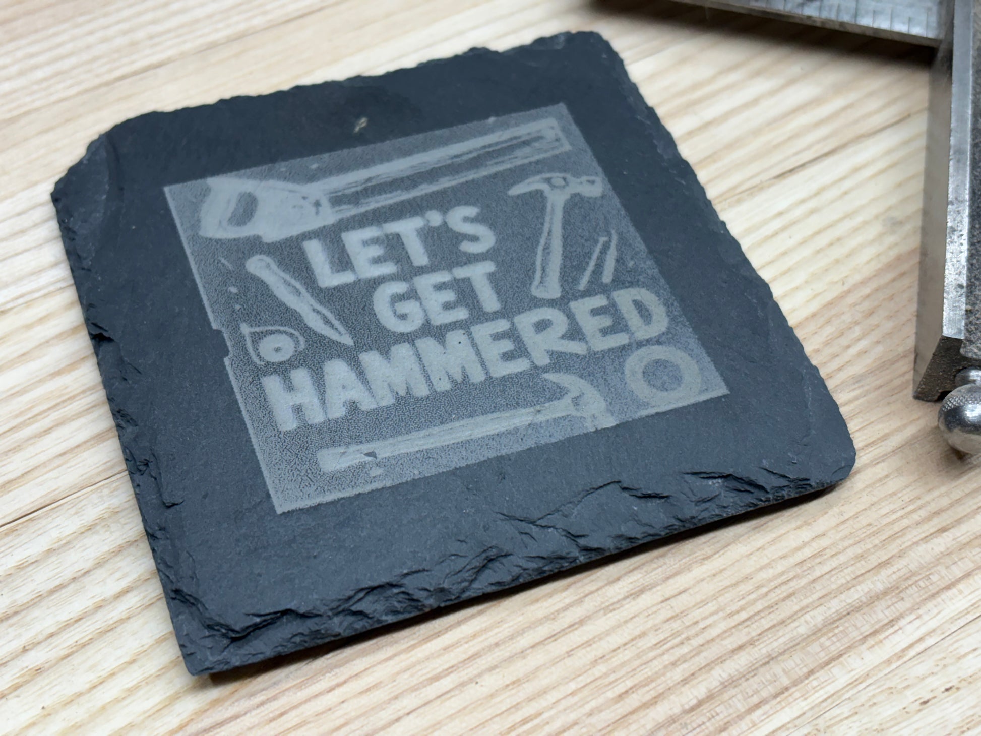 The engraved slate coaster with the Get Hammered image will be a natural accent to your table décor with slate coasters by MHH Woodworking. They are a great decorative option to keep your table free of water marks and beverage stains.